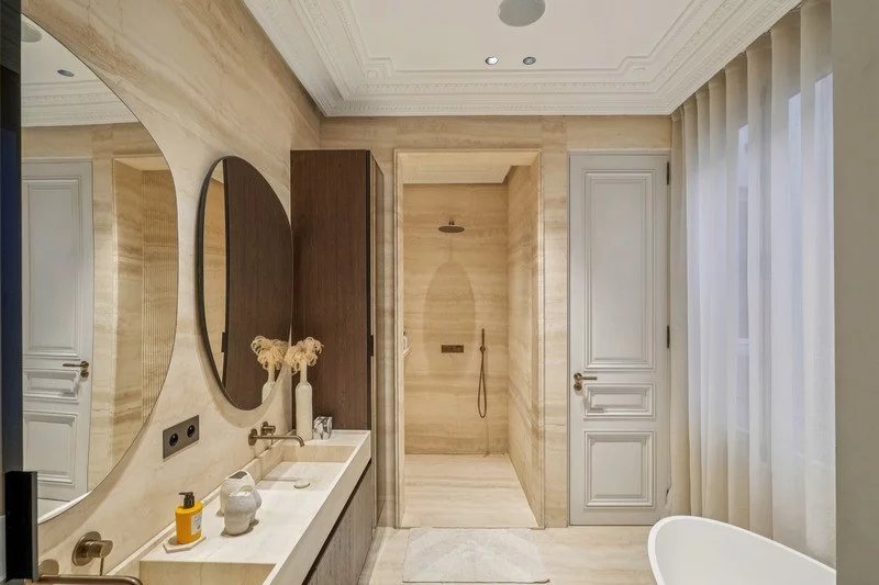 Les matériaux ont été sélectionnés avec soin : parquet Versailles, travertin, menuiseries sur mesure.