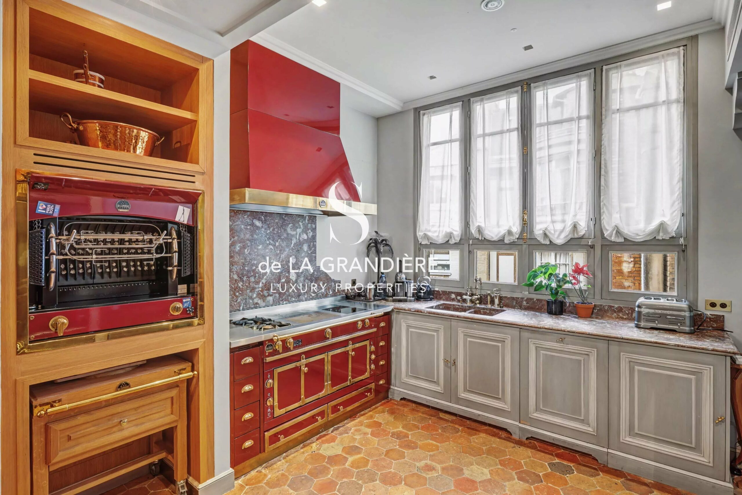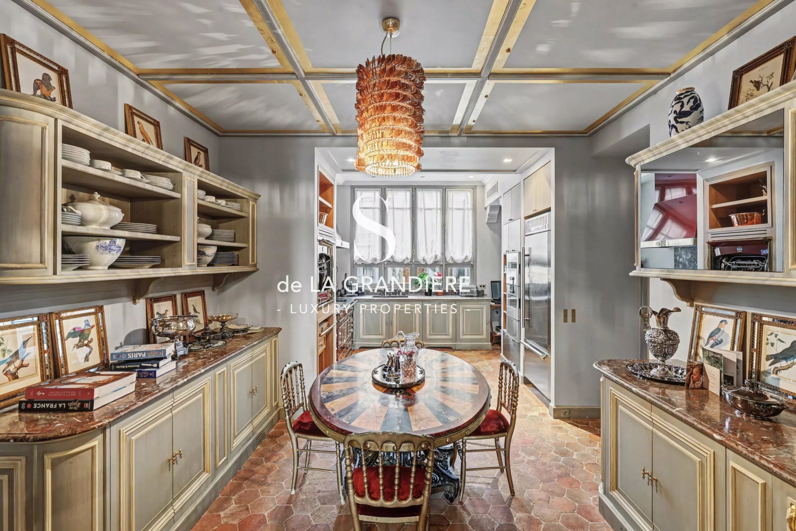 The 35 sqm kitchen, designed as a kitchen–dining room, features a La Cornue range and serves as a central, convivial and highly functional space.